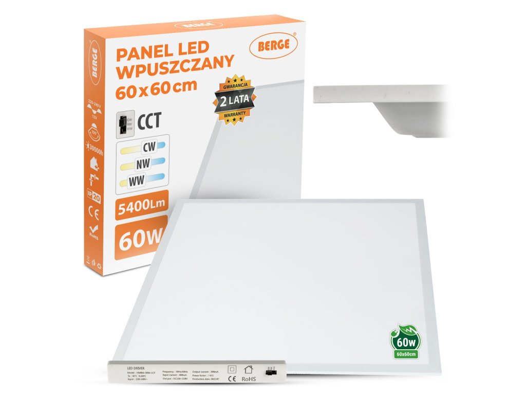 Stojí za zmienku, že stropný LED panel 60W CCT 60x60 cm na zapustenie do podhľadu s napájaním je vybavený funkciou CCT, čo znamená, že je možné nastaviť farebnú teplotu svetla.