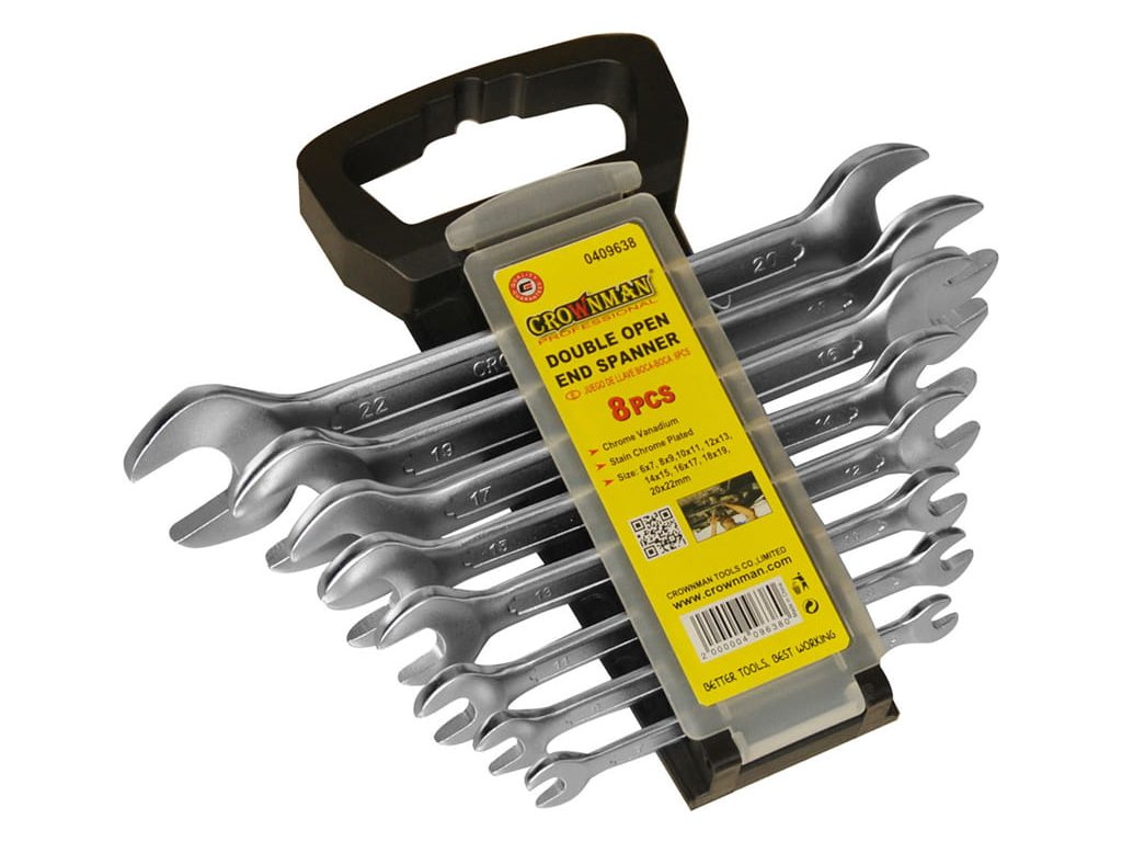 Množstvo v sade: 8 kusov Materiál: Chrómovaná chróm-vanádiová oceľ Rozmery: 6x7 mm, 8x9 mm, 10x11 mm, 12x13 mm, 14x15 mm, 16x17 mm, 18x19 mm, 20x22 mm