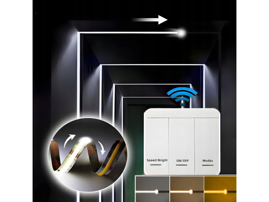 ✨ Efekt płynącej fali światłaZastosowana w zestawie technologia IC DIGITAL (WS2811) sprawia, że światło nie zapala się jednocześnie na całej długości taśmy. Zamiast tego uruchamia się sekwencyjnie, tworząc wrażenie, jakby światło płynęło wzdłuż taśmy – podobnie do fali lub strumienia wody. Podczas włączania, wyłączania oraz regulacji jasności, światło stopniowo „przechodzi” po całej długości taśmy, bez gwałtownych skoków intensywności. Efekt jest płynny, spokojny i bardzo estetyczny, co wyraźnie odróżnia ten zestaw od klasycznych, natychmiast zapalających się taśm LED. Dzięki połączeniu efektu fali z technologią COB, linia światła pozostaje jednolita i gładka — bez punktów świetlnych. Oświetlenie staje się elementem aranżacji wnętrza, a nie tylko źródłem światła, nadając przestrzeni nowoczesny i elegancki charakter. | |