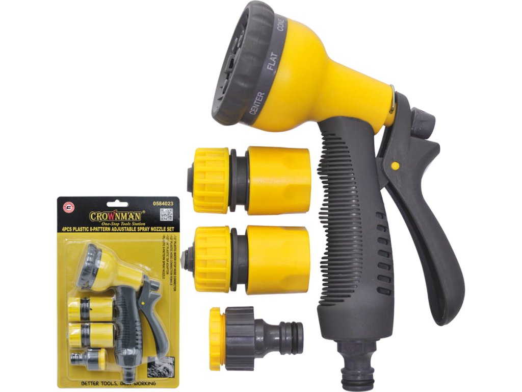 Montážna sada: Sada obsahuje 4 plastové hadicové koncovky vrátane koncovky proti vode, koncovky samice, adaptéra na kohútik a nastaviteľné striekacie pištole.