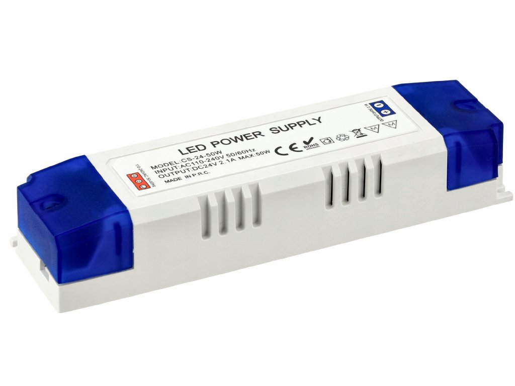 LED zdroj 24V 50W 2,08A - kompaktný transformátor pre LED pásky a ďalšie zariadenia napájané 24V. Ideálne pre aplikácie v suchých priestoroch, ako je nábytok alebo domáce osvetlenie.